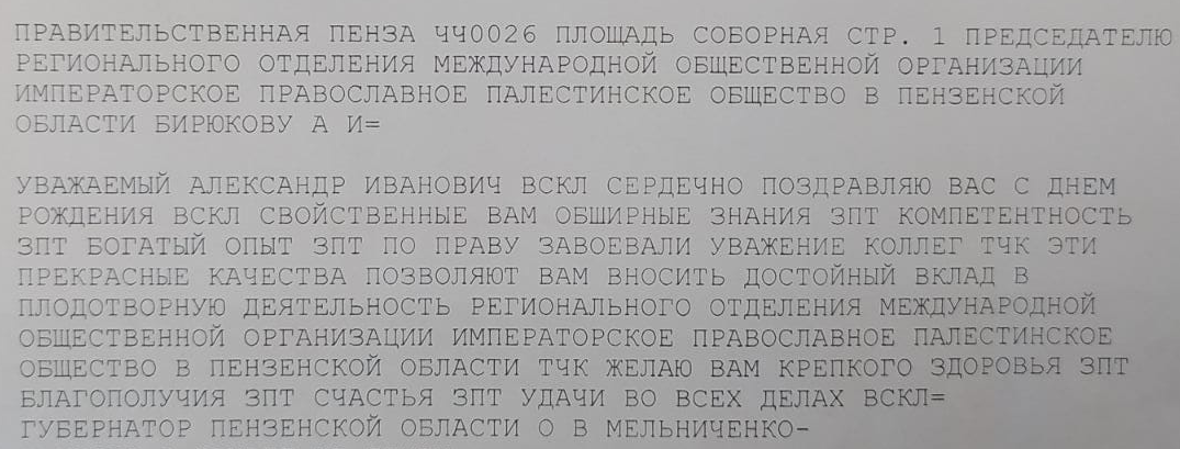 Председателю Регионального отделения Международной общественной организации Императорское Православное Палестинское Общество в Пензенской области Бирюкову А. И.