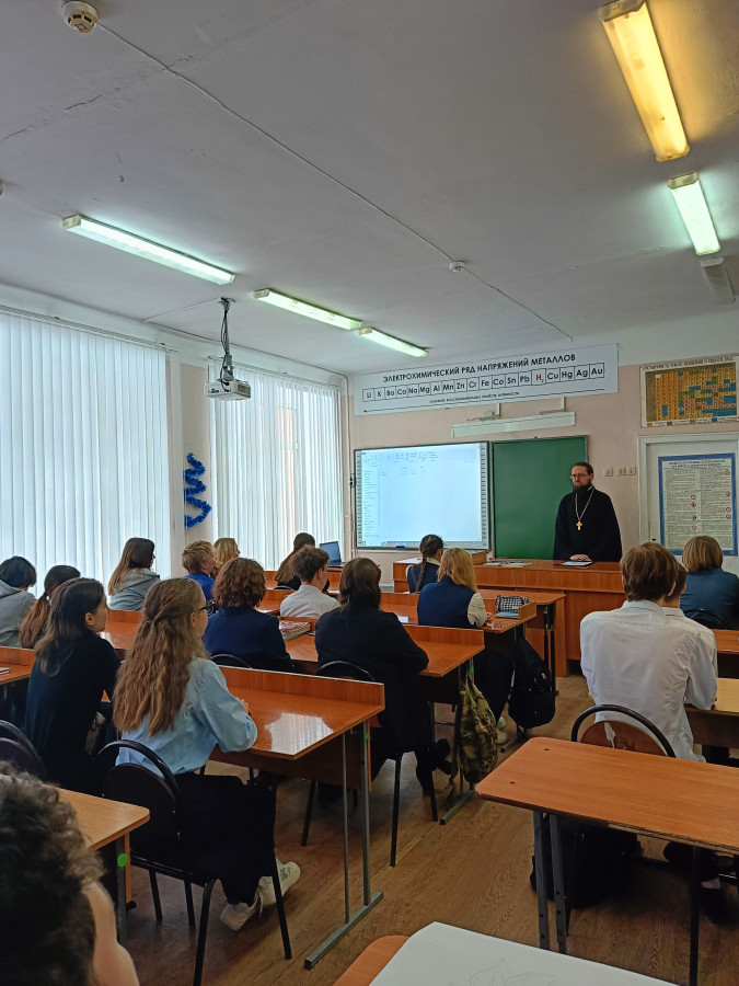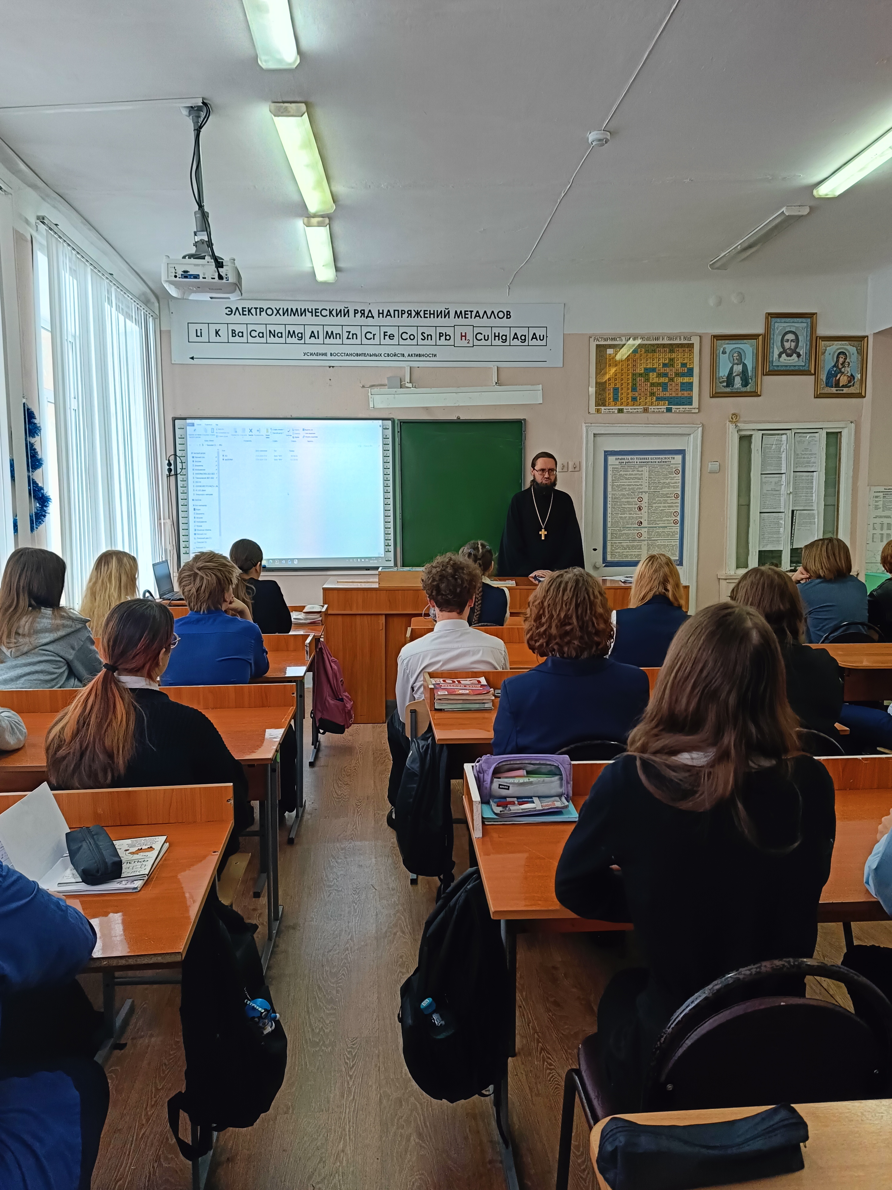 Священнослужитель встретился с учащимися 9-11 классов и рассказал школьникам о Российском православном университете, направлениях подготовки, а также о правилах поступления и необходимых для этого предметах ЕГЭ.