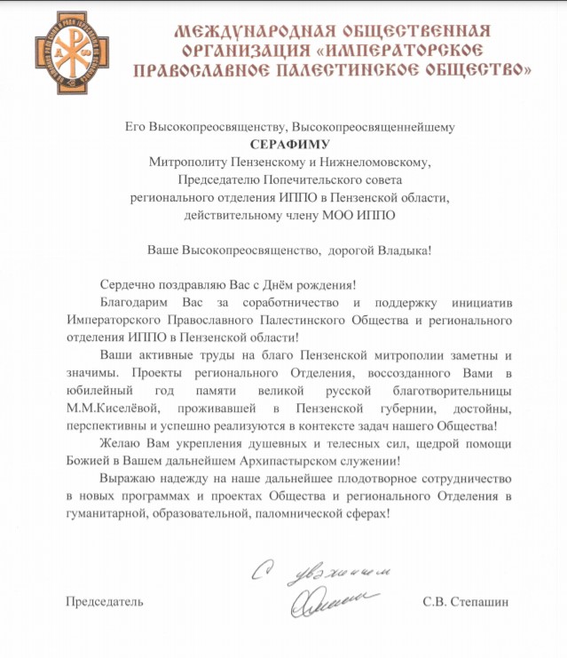 25 сентября Председатель ИППО Сергей Степашин поздравил с днем рождения председателя Попечительского совета Пензенского отделения ИППО митрополита Пензенского и Нижнеломовского Серафима.