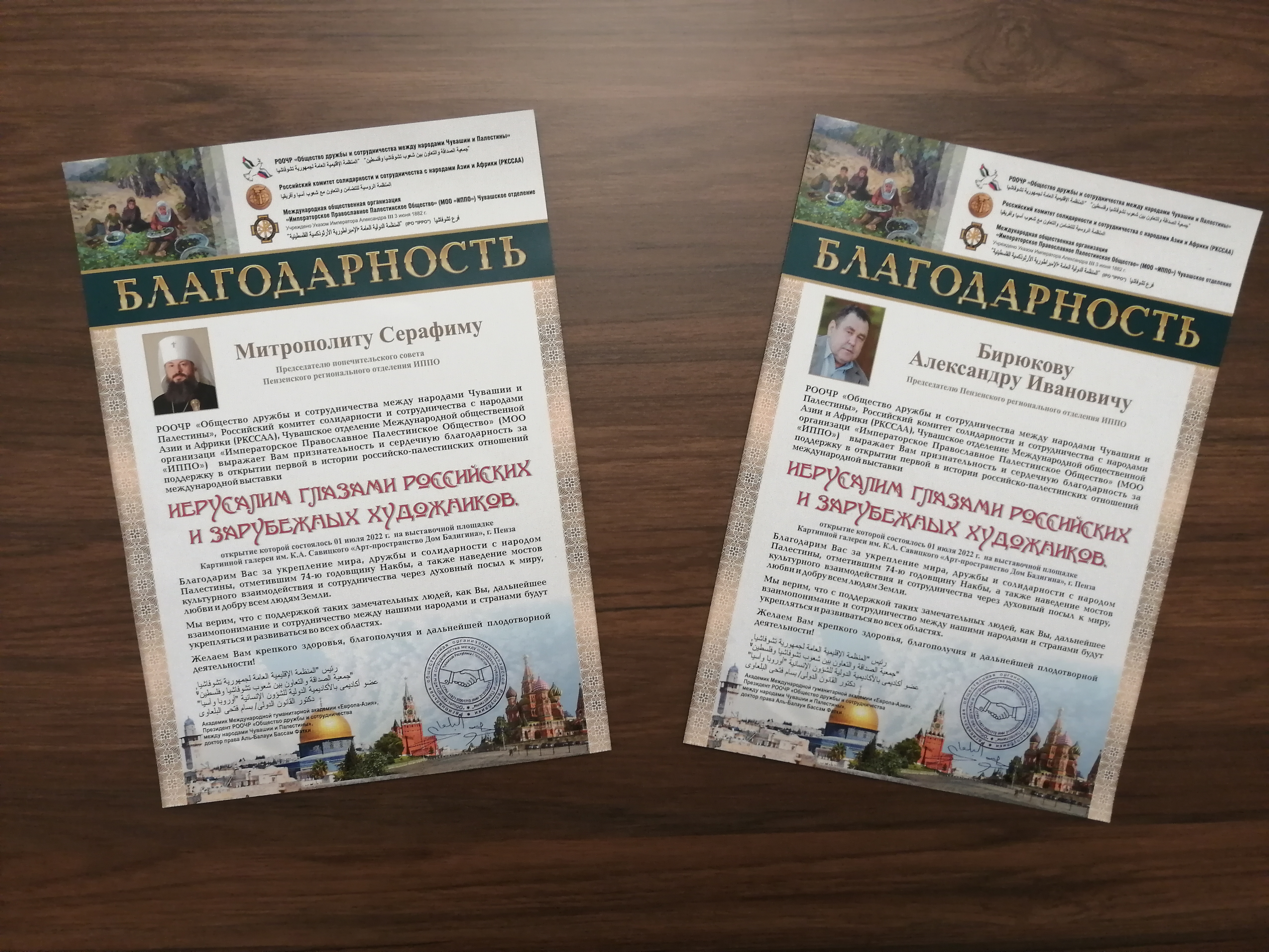 Президент Общества дружбы и сотрудничества между народами Чувашии и Палестины Аль-Балауи Бассама Фатхи выразил благодарность митрополиту Пензенскому и Нижнеломовскому Серафиму и Председателю Пензенского отделения ИППО Бирюкову Александру Ивановичу за поддержку в открытии первой в истории российско-палестинских отношений международной выставки «Иерусалим глазами российских и зарубежных художников».