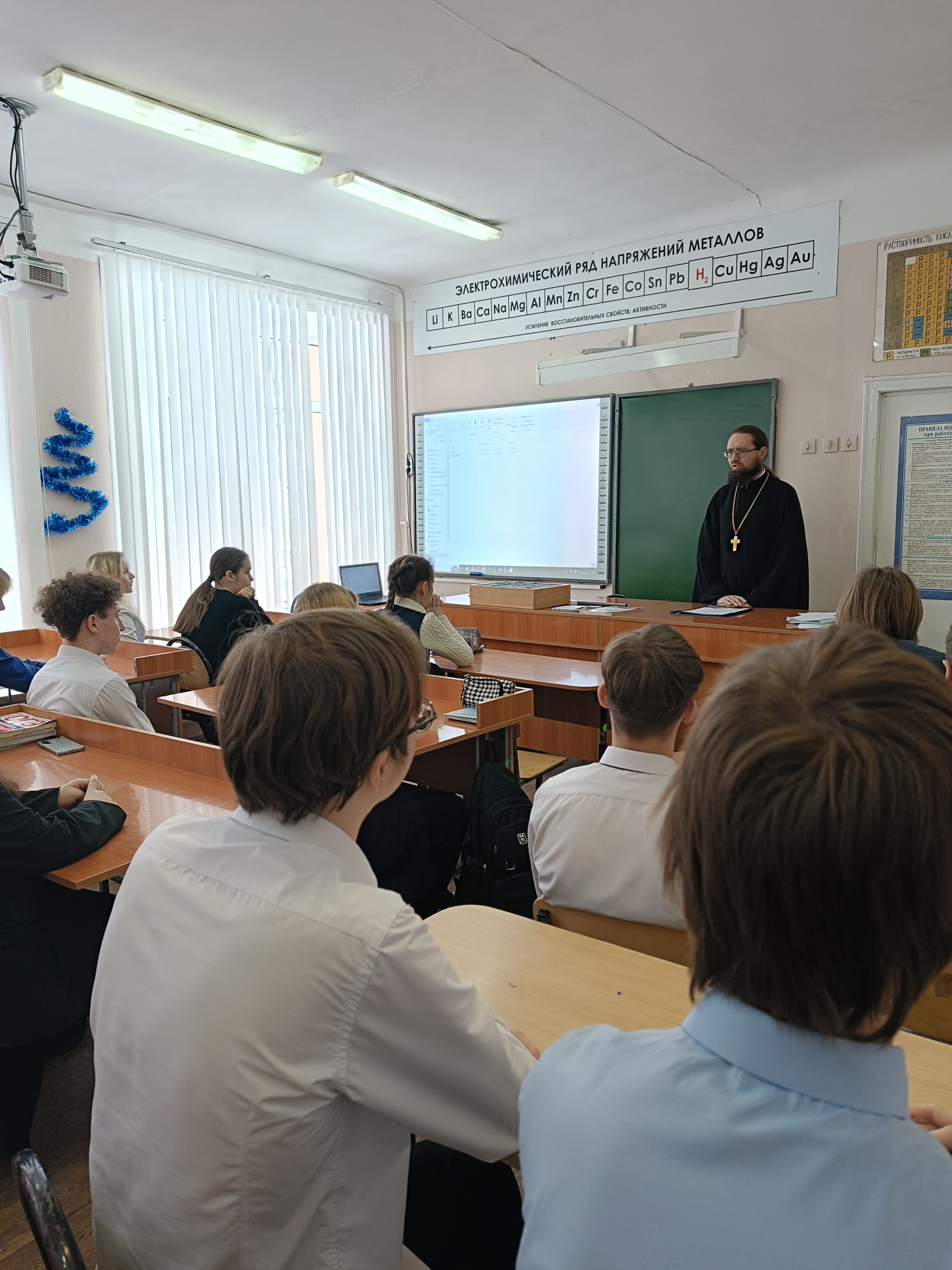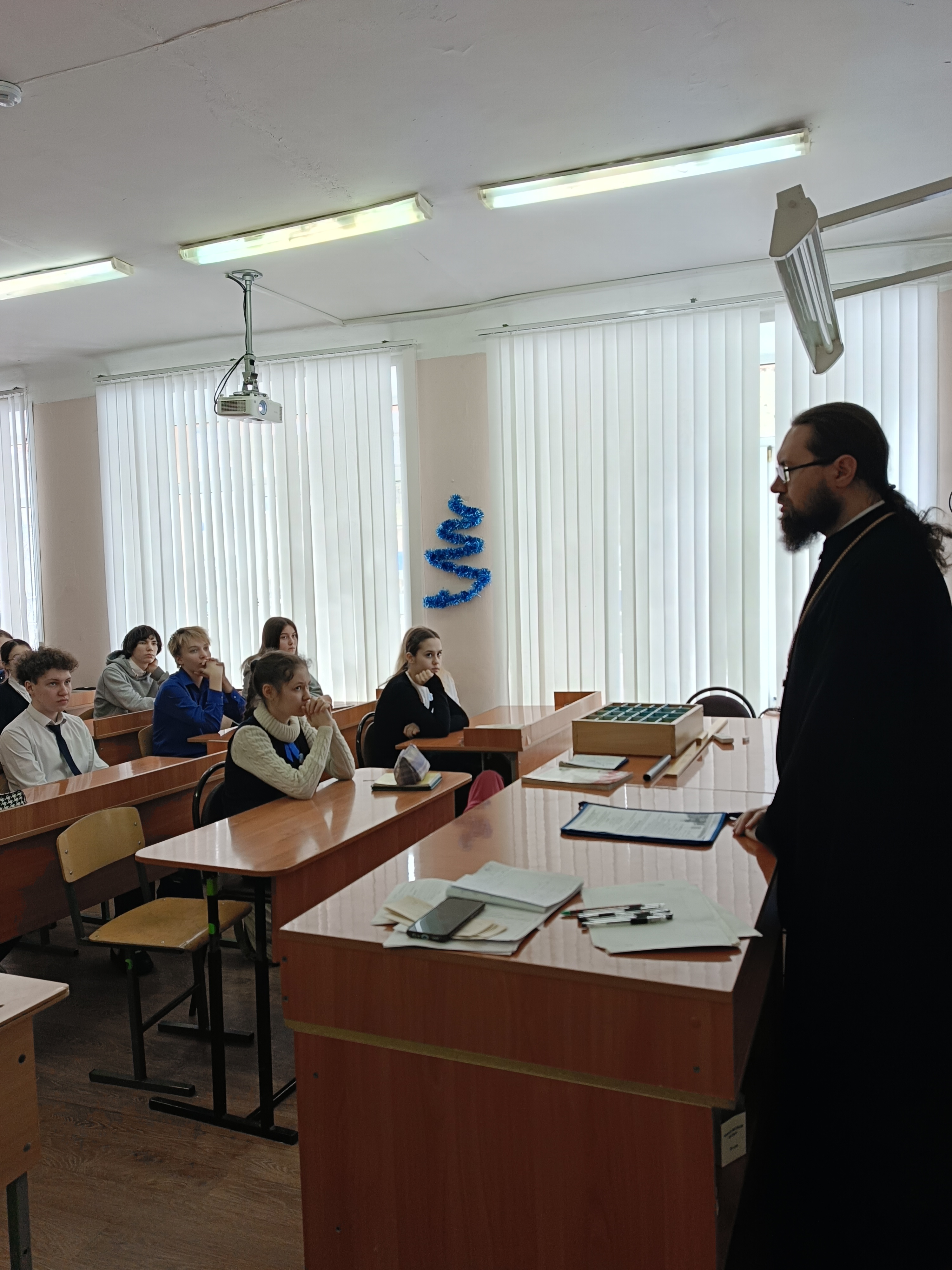 Священнослужитель встретился с учащимися 9-11 классов и рассказал школьникам о Российском православном университете, направлениях подготовки, а также о правилах поступления и необходимых для этого предметах ЕГЭ.