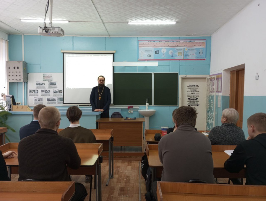 Священнослужитель рассказал школьникам о Российском православном университете, направлениях подготовки, а также о правилах поступления и необходимых для этого предметах ЕГЭ.